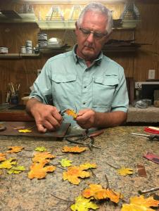 "As I was living my childhood in a small country Texas town, I discovered a fascination with leaves. My curiosity lead me to wonder why and how a leaf was formed, why did the tips curl a certain way as it dried, why were the veins on top of some leaves and underneath on others, or how was it possible that they could turn a different color. As life progress, my fascination focused on other things and forgot about the leaves.. Moving forward forty years, my brother gave me a piece of mesquite wood from which I made a lamp base. Of course I needed a lampshade and decided that it had to be copper. I had never worked with copper before, but was determined to make a copper shade. Once I gathered all the materials, my attempt to fabricate my first shade was a through trial and error. Finally after many attempts, a shade was born. Those first lampshades lead me to art shows and other opportunities that I never thought were possible. I became bored with making lampshades and wanted to create something that I could hold in my hand, so I decided to make a leaf. As I began to make the leaf, the memory of my little childhood nature classes surfaced and assisted me in creating my leaves I create today. I like to think that a higher being had a plan for me from the beginning.