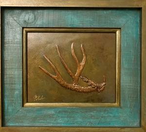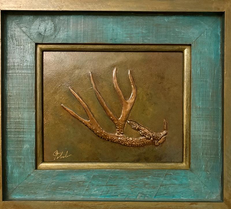 "Another Season" Repousse and chasing process was used to craft the Antler and Background. Wood Frame 20"x22" $695