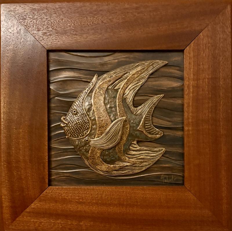 "Angel Nouveau" Handcrafted Copper Angelfish. Three layered process. Copper Background. Custom Ribbon Mahogany Frame 12"x12" $895