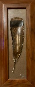 "Gobble" Life size copper Turkey Feather. Walnut Frame 10"x24" $695